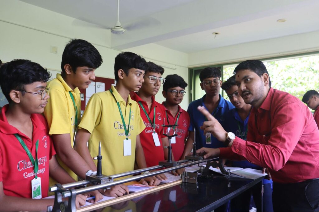 Students conducting a Physics Experiment in the lab at Chaitanya School, showcasing hands-on learning at the Best CBSE School in Gandhinagar.